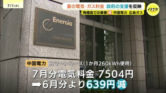 中国電力と広島ガスは、7月から9月までに請求する電気料金とガス料金に、国の支援を反映します。