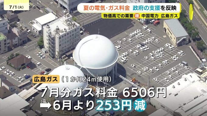 また広島ガスでは、標準家庭の7月分のガス料金は6506円で、6月より253円の値下がりとなります。