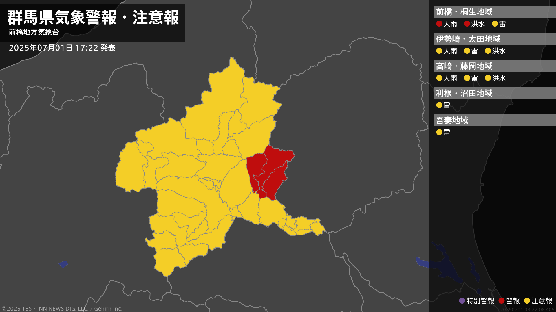 気象台は、午後5時22分に、洪水警報を桐生市、みどり市に発表しました。