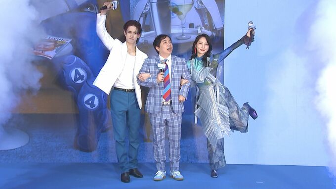 JO1の佐藤景瑚さん、霜降り明星のせいやさん、タレントのファーストサマーウイカさんが、映画『ファンタスティック4:ファースト・ステップ』~ここからファーストステップイベント~ に、ファンタスティック4をイメージしたブルーを取り入れた衣装で登壇しました。