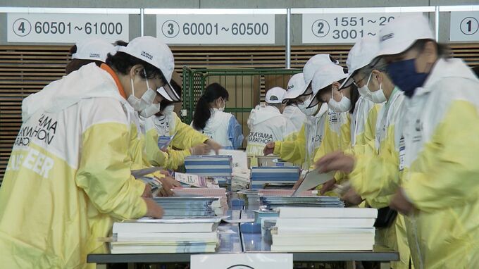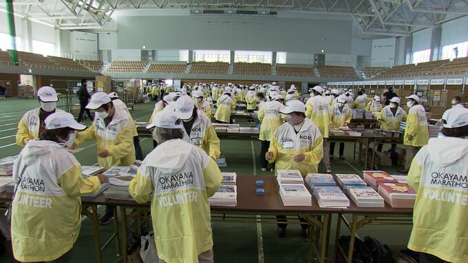 あす(12日)、ランナーの受け付けが行われるジップアリーナ岡山では、ボランティアがパンフレットの袋詰めを行いました。