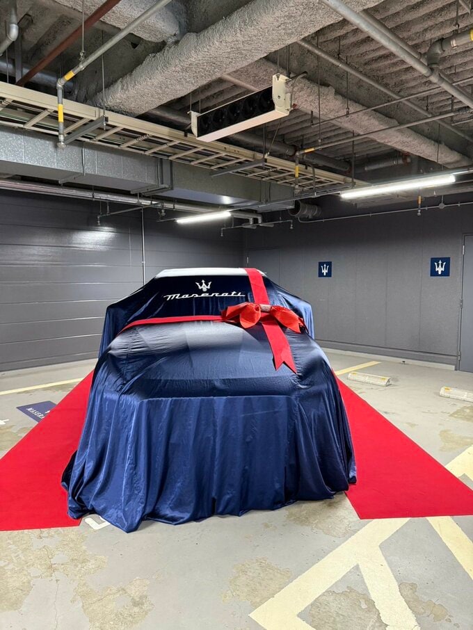 投稿された写真には、鮮やかな青いカバーで覆われたマセラティが写っています。カバーの正面には「Maserati」のロゴが見え、上部には赤いリボンが飾られているのが確認できます。