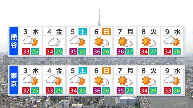 4日(金)頃から夏空が広がるでしょう。熊谷では5日(土)以降、連日35℃以上の猛暑日、東京も6日(日)は36℃まで上がる予想です。