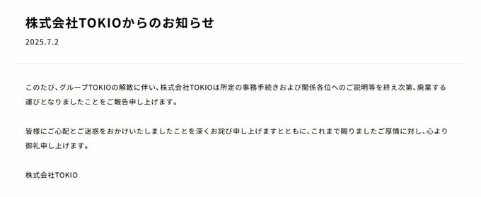 公式サイトでは「このたび、グループTOKIOの解散に伴い、株式会社TOKIOは所定の事務手続きおよび関係各位へのご説明等を終え次第、廃業する運びとなりましたことをご報告申し上げます。」と、投稿。