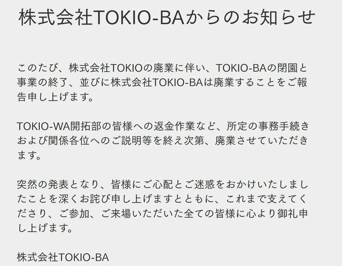 2日、TOKIO-BAの公式サイトが更新され、株式会社TOKIOの廃業に伴い「TOKIO-BAの閉園と事業の終了」と「株式会社TOKIO-BAの廃業」が発表されました。