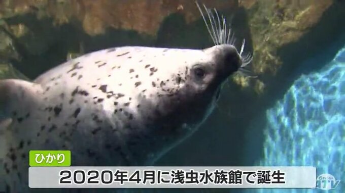 2020年に青森市の県営浅虫水族館で生まれたメスのゴマフアザラシ・ひかりが、引越し先の静岡県の水族館に到着し、元気に過ごしています。