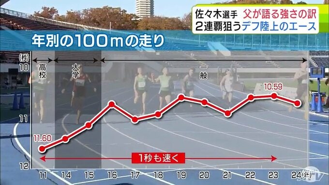 高校年代最後の年に『11秒60』だった自己ベストは、現在も所属する仙台大に進学して成長を重ね、30歳になる2023年には『10秒59』をマーク。