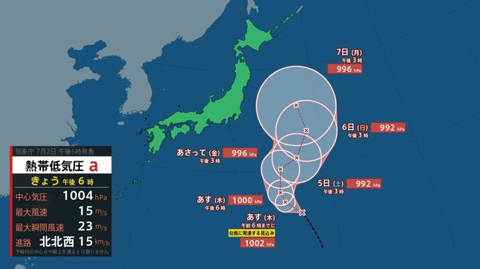 【台風情報】予想進路が“ぐにゃり” 台風3号(ムーン)発生へ 5日~7日にかけて日本方面に進路変更で近づくか 台風いつ・どこへ?【雨と風の予想シミュレーション・気象庁の最新情報】 青森テレビ 2025年7月2日(水) 21:30 国内 台風進路 熱帯低気圧aの予報