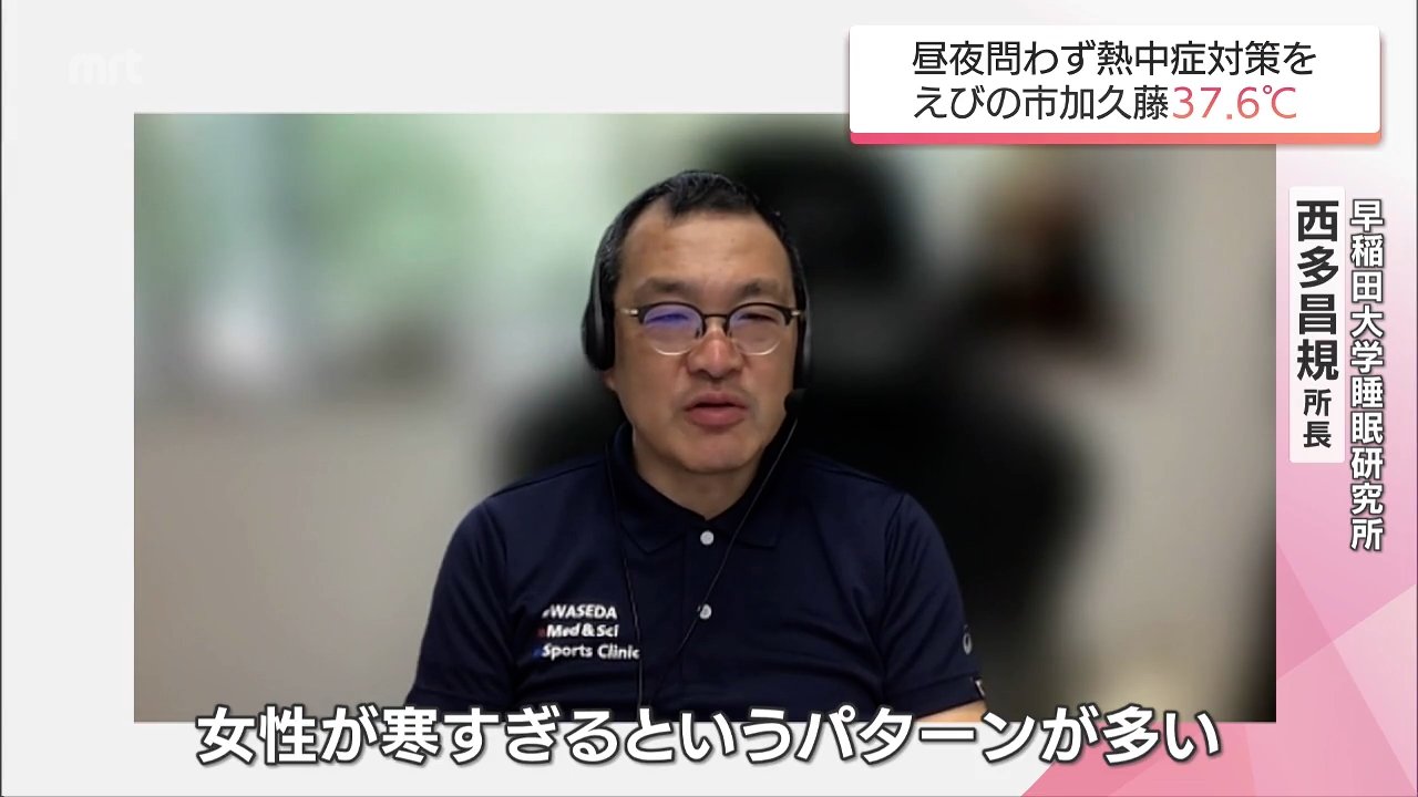 一方、西多所長は体が冷えすぎるからと言ってエアコンの設定温度を上げ過ぎると、「暑くて眠れなくて寝不足になる。また、最悪の場合には熱中症になるおそれもある「として、上手にエアコンを使ってほしいと話しています。