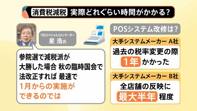 TBSスペシャルコメンテーター・星浩氏によりますと、「参院選で減税派が大勝した場合、秋の臨時国会で法改正すれば、最速で1月からの実施ができるのでは」とのことです。