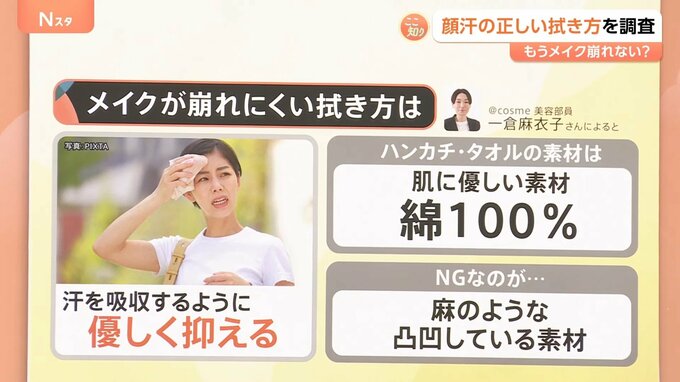 やはりゴシゴシ拭くのはNGだということで、汗を吸収するように優しく抑えること。ハンカチやタオルの素材は、肌に優しい素材「綿100%」のものを使うと良いそうです。