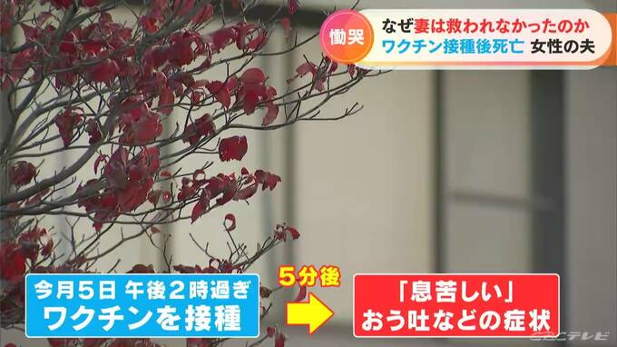 妻は、5日の午後2時過ぎ、市内の集団接種会場でワクチンを接種しましたが、その5分後、「息苦しい」と体調悪化を訴え、嘔吐などの症状も出ました。