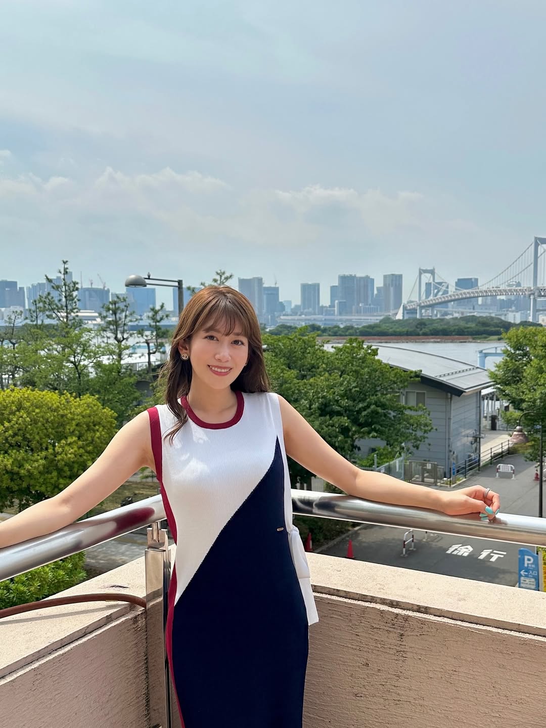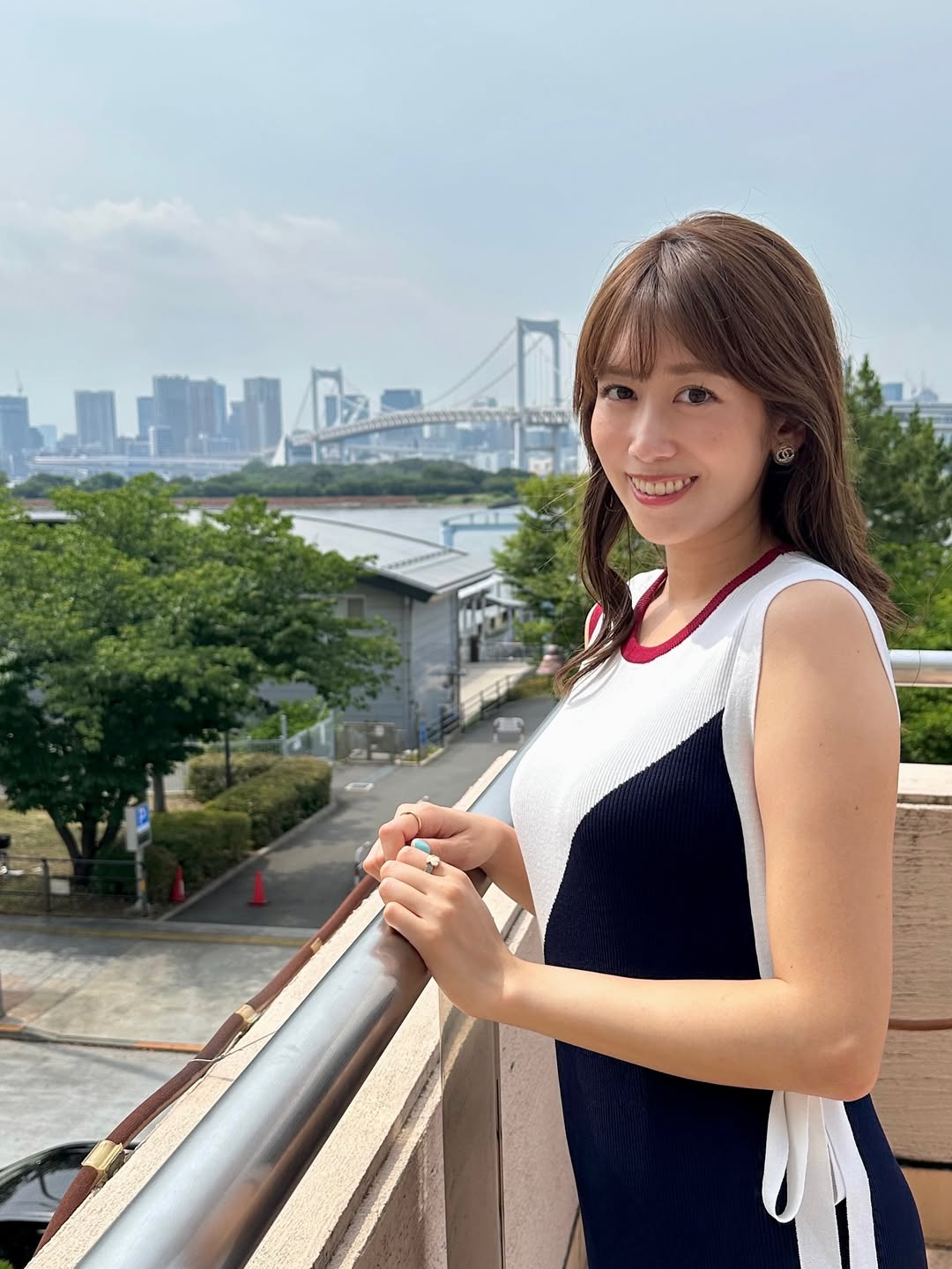 撮影された写真には、レインボーブリッジや緑豊かな景色をバックに、リラックスした表情の中川さんが収められています。
