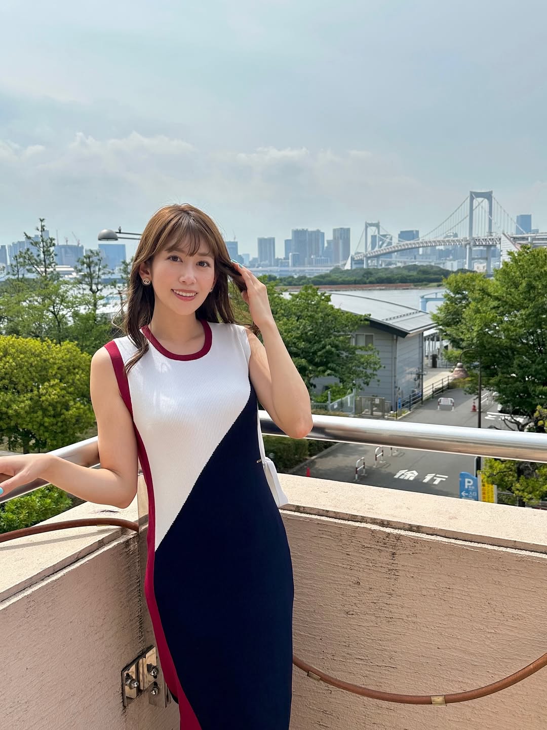 着用しているのは白と紺色のノースリーブワンピースで、赤いネックラインがアクセントになった爽やかなデザイン。夏の装いにぴったりの一着で、都会的な景観との相性も抜群です。