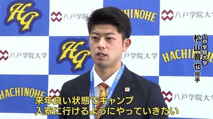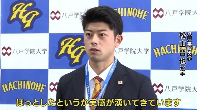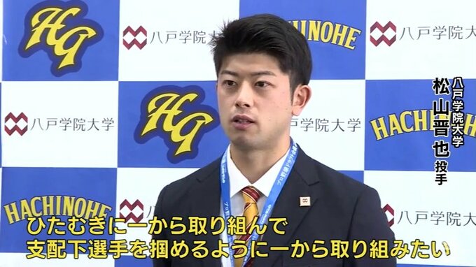 松山投手は188センチの長身から投げ下ろす最速154キロのストレートが武器の本格派右腕。七戸町で生まれ、小学4年で野球を始めて以来、大学まで一貫して地元・青森で鍛錬を続け、プロの夢を追ってきました。