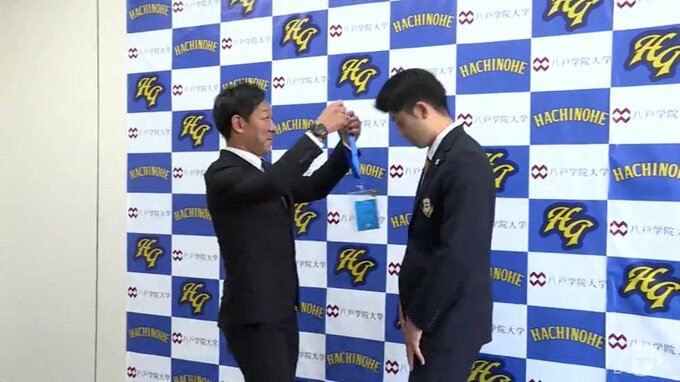 中日ドラゴンズの松永幸男スカウト部長と八木智哉スカウトは11日、八戸学院大学の松山晋也投手のもとを訪れ、ドラフト会議で育成1位指名の挨拶をしました。