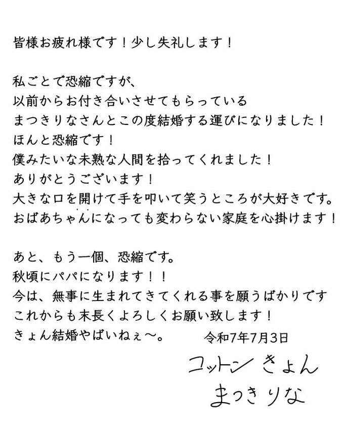 きょんさんは「私ごとで恐縮ですが、 以前からお付き合いさせてもらっている まつきりなさんとこの度結婚する運びになりました!」と、報告。