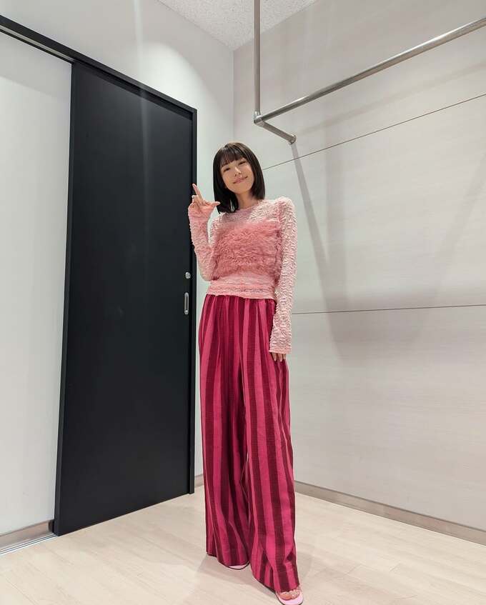若槻さんは「本田翼ちゃんに憧れているんだと思います!!」と、心中の推しを強調。さらに、TBSの朝番組に出演した際の衣装も投稿。黒を基調とした1枚目の写真とはうって変わって、こちらはピンクのファー付き長袖のカットソーに濃淡ピンクのストライプが入ったワイドパンツを合わせていて、夏らしく際立っています。