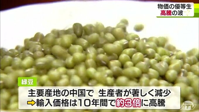 値上げの大きな要因、それが原料となる種子の高騰です。なかでも需要が大きい緑豆(りょくとう)は主要な生産地の中国で生産者の減少が著しく、輸入価格はこの10年で約3倍、1トン30万円に跳ねあがりました。