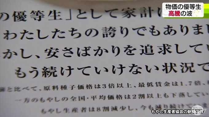 値上げの波は物価の優等生モヤシにまで及び、少しずつ暮らしに影を落とし始めようとしています。