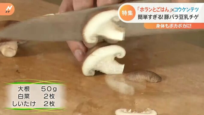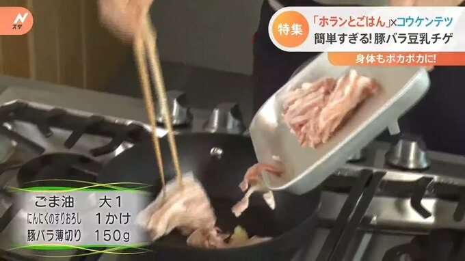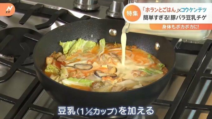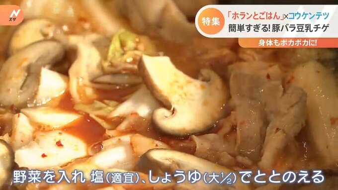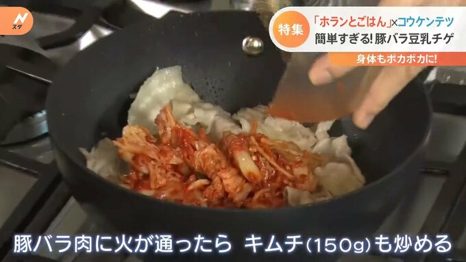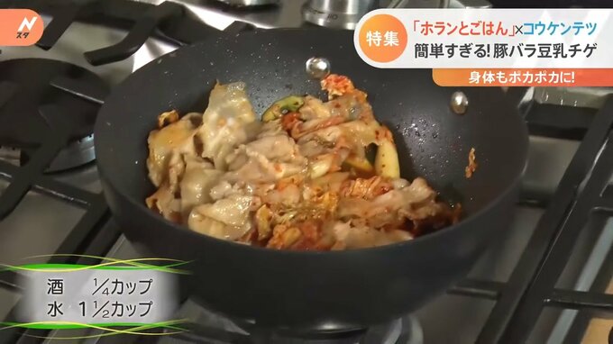 「今回“豆乳チゲ”なんですけど、最初から豆乳で煮るのではなくて、お酒。先にお酒を入れてからあとにお水」