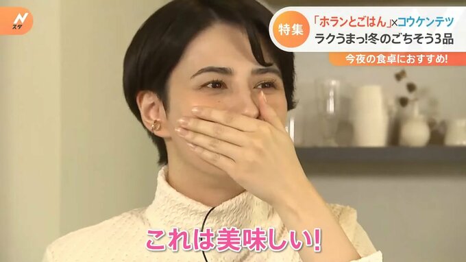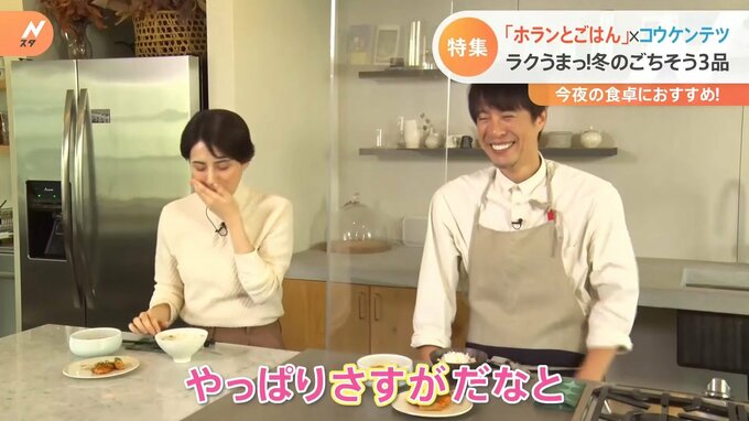「完成いたしました~!いただきまーす!鶏むねれんこんからですかね」「やわらか!これは美味しい!」