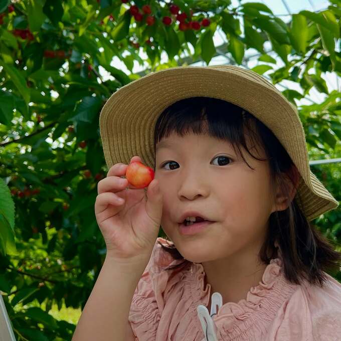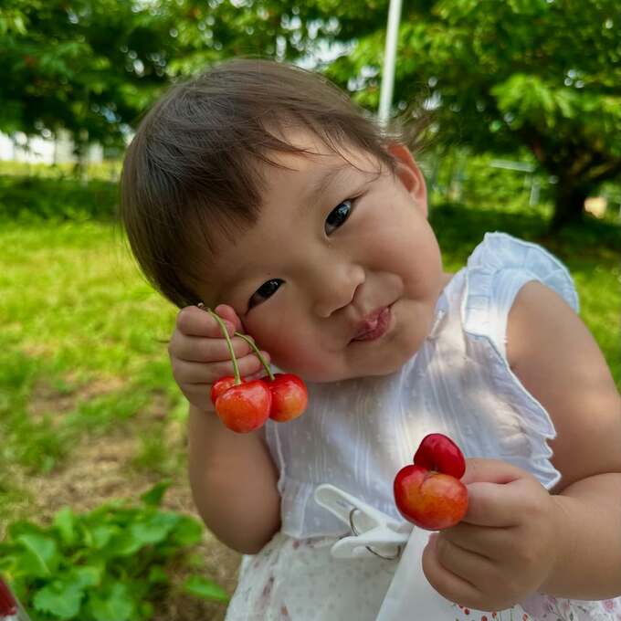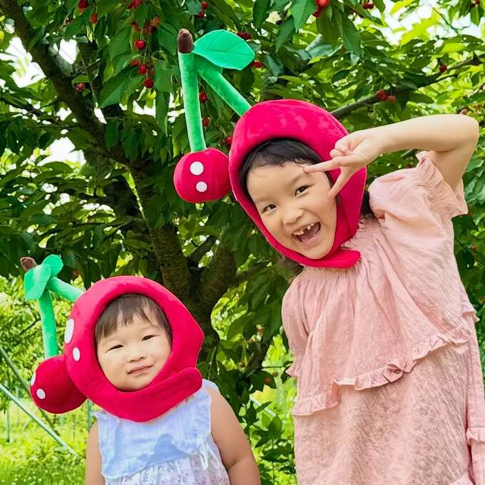 投稿された写真には、さくらんぼが実る果実園をバックにののちゃんと妹・ひーちゃんが大きなさくらんぼの被り物しポーズをとる姿や、実際のさくらんぼを手に持って楽しむ様子を紹介しています。