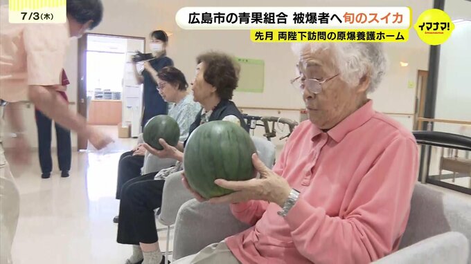 暑い夏を乗り切ってもらおうと、広島市の青果組合が旬のスイカを原爆養護ホームへプレゼントしました。およそ100人の被爆者が暮らす安芸区の原爆養護ホーム、「矢野おりづる園」です。東部広島青果卸売組合が旬の…