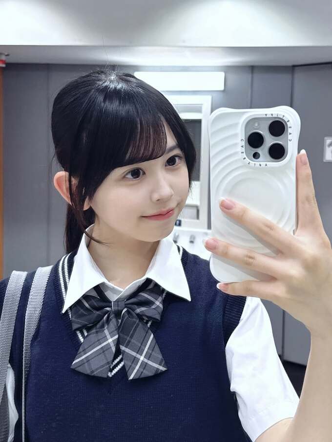 写真では、清潔感のある部屋の鏡の前で白いシャツに紺色のベスト、チェック柄のリボンという制服姿を披露。指で頬を軽く押しながらポーズをとり、可愛らしい表情を見せています。
