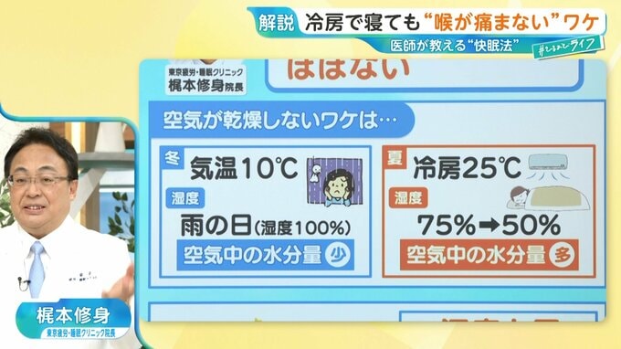 「ひるおび」で睡眠時のギモンについてLINEアンケートを行ったところ、やはり多かったのがエアコンに関するお悩み。冷房をつけたままだと喉が乾燥してしまうのでしょうか?