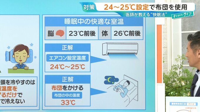 梶本医師は、寝室のエアコンの設定温度は24℃~25℃にして部屋はしっかり冷やし、体は布団をかけて温めることを推奨しています。