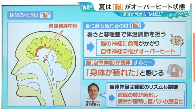 夏は、暑さや寒暖差により体温調節を担う脳の神経に負荷がかかり、自律神経中枢がオーバーヒートしている状態になります。