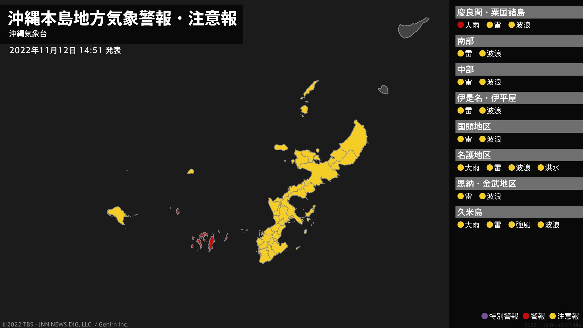 気象台は、午後2時51分に、大雨警報(土砂災害)を渡嘉敷村、座間味村に発表しました。また大雨警報(浸水害)を渡名喜村に発表しました。