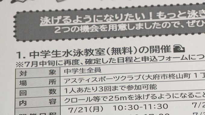 それでも、生徒たちが水泳に親しむ機会を確保しようと、市は夏休み期間に、スポーツクラブの水泳教室に1人3回まで無料で通えるようにしたり、公営プールを無料で使えるチケットも配布しています。