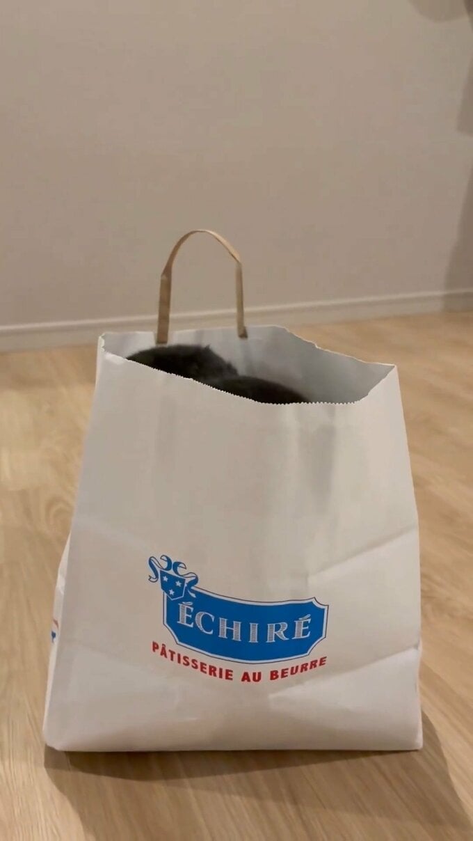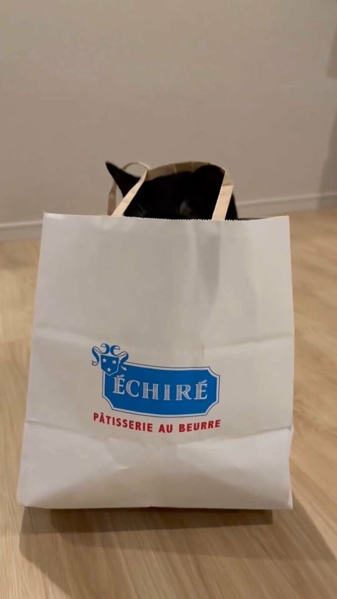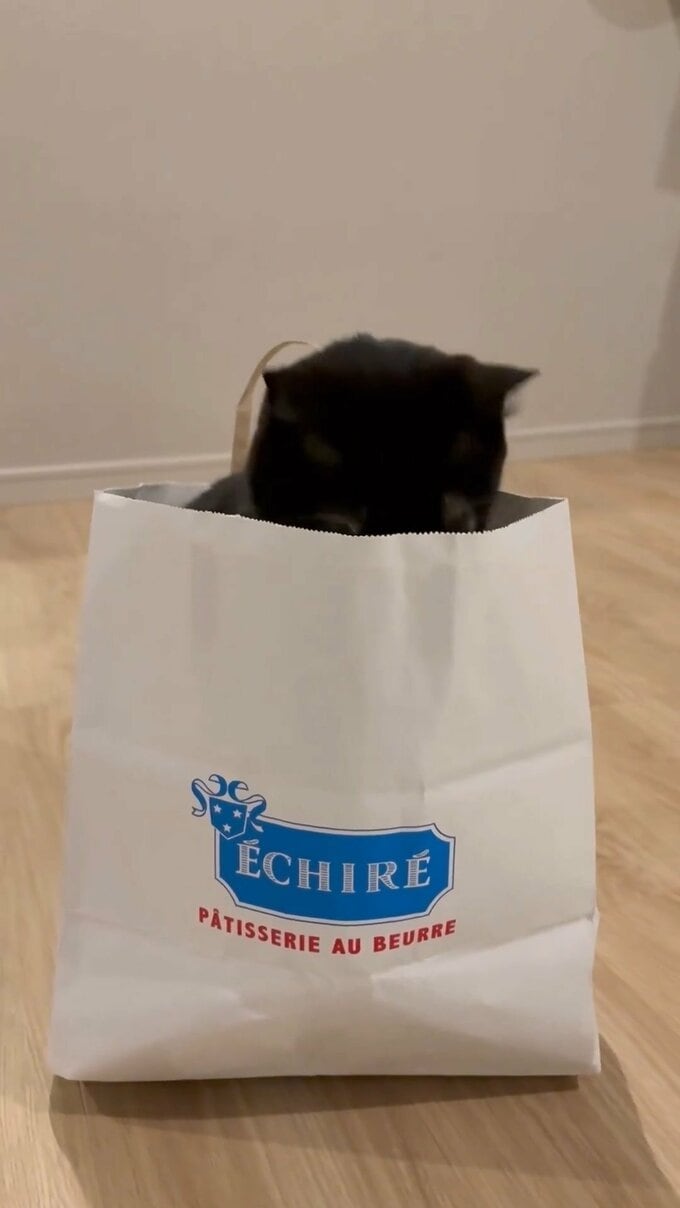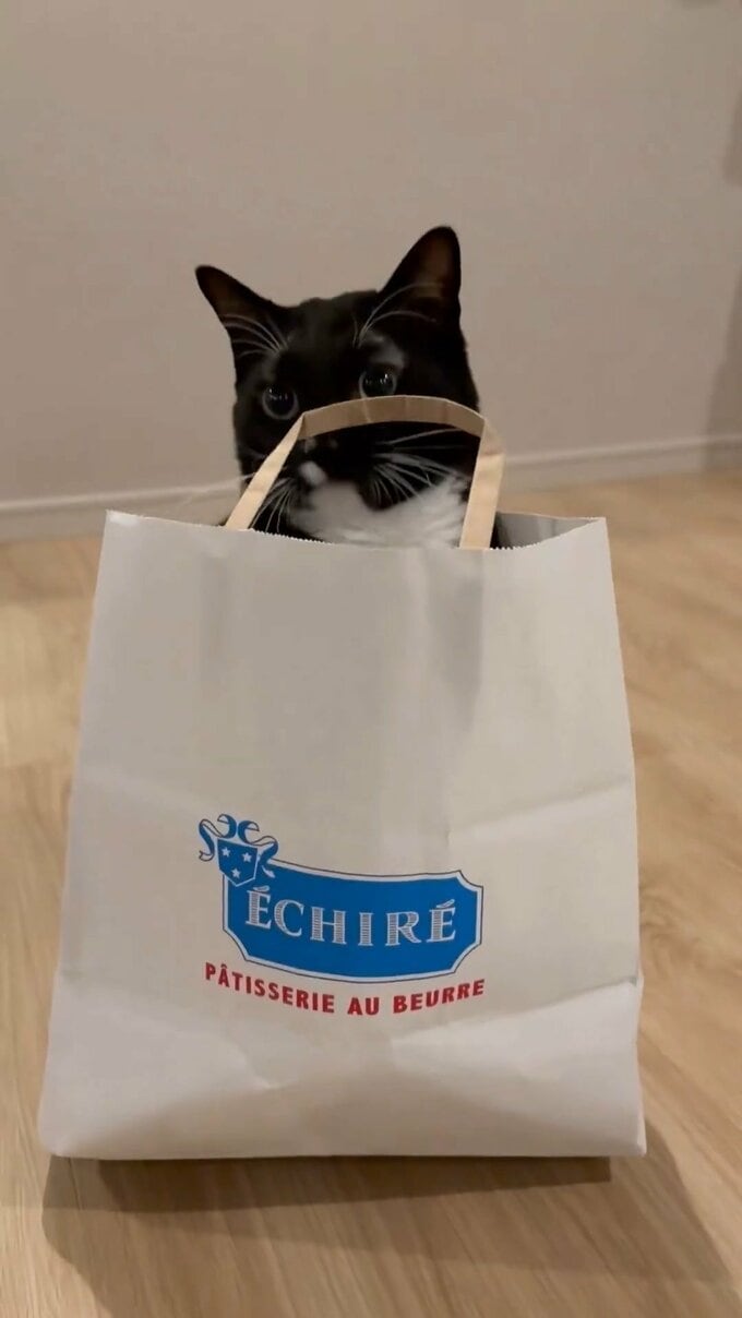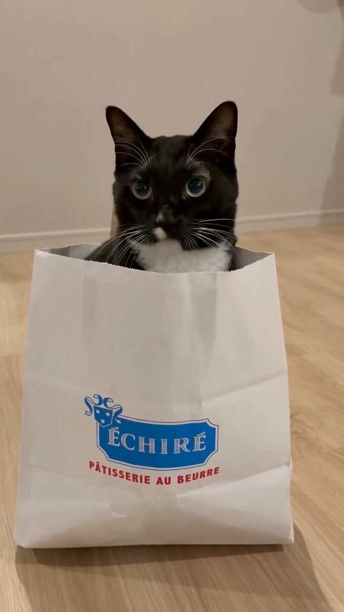 藤さんは、一編の動画を投稿。冒頭に、フランス産の高級バター「エシレ」の紙袋が登場します。その紙袋が細かく震えたと思うと、中から勢いよく、藤さんの愛猫・マルが顔を出しました。