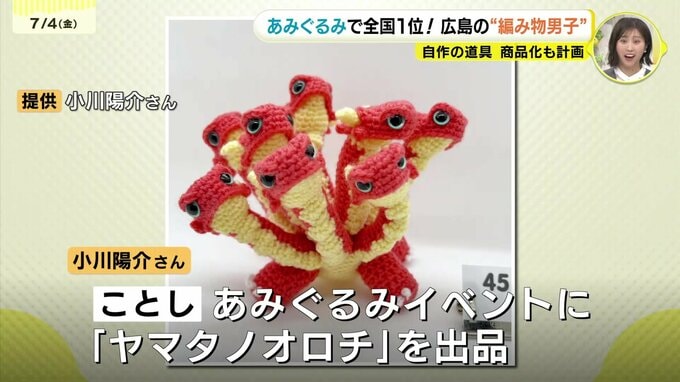 あみぐるみとは、「編み物」と「ぬいぐるみ」を組み合わせた造語で、かぎ針編みで作る小さな人形などのことを指します。小川さんは今年、日本最大級のあみぐるみイベントに「ヤマタノオロチ」のあみぐるみを出品し、見事、1位になりました。