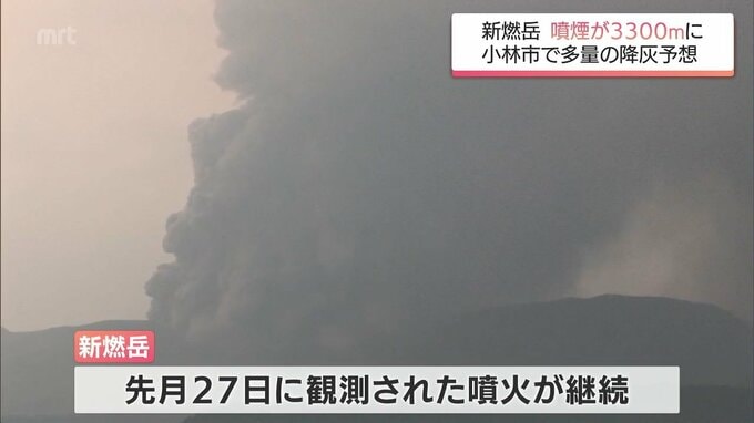 気象台によりますと、新燃岳では先月27日に観測された噴火が続いていて、きょう午後4時40分には、噴煙の高さが3300メートルを超えました。