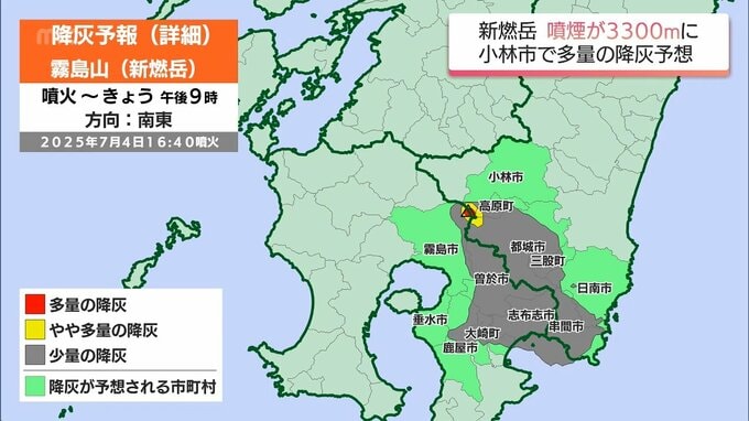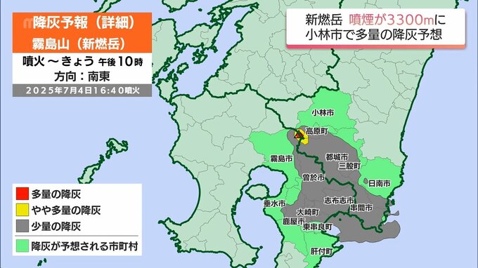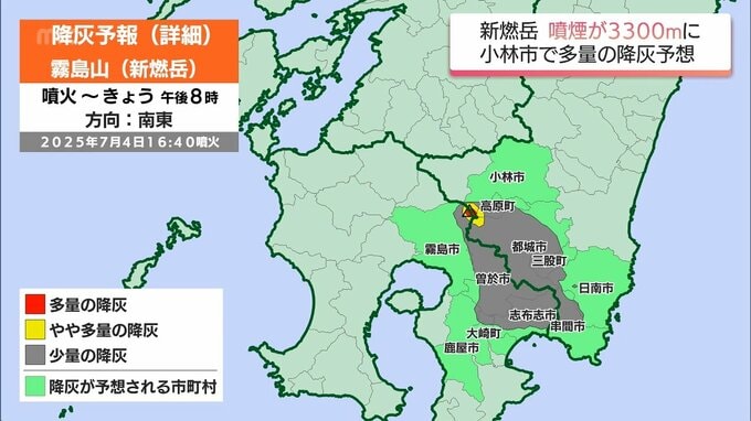 夕方には噴煙の高さが3300メートルを超え、小林市では多量の降灰が予想されています。