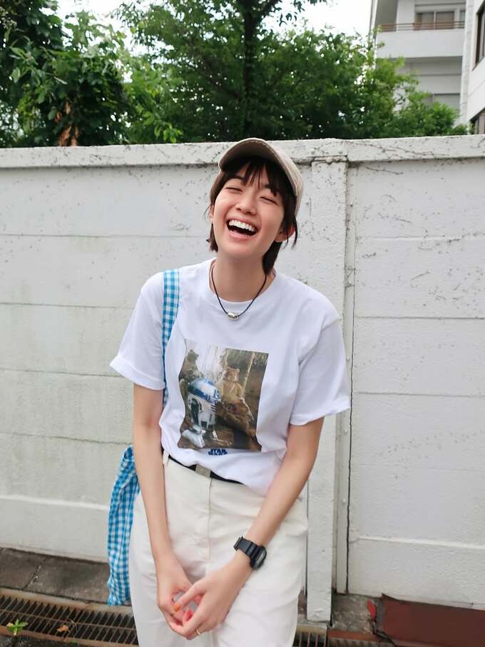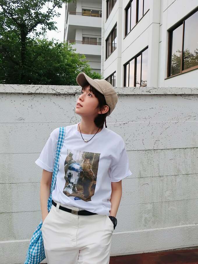 スターウォーズのキャラクターがプリントされた白のTシャツに、オフホワイトのパンツという爽やかコーデを披露した佐藤さんは、「今年の夏のうちにこのTシャツを着て、ディズニーランドのスターツアーズに行くのが夢です」と、今夏の目標を告白。
