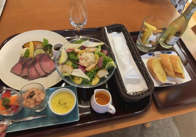 川崎さんは「お祝い膳」と題して、「産院のお祝い膳 すごい」と投稿。写真では、真ん中にシーフードが盛られたボウルいっぱいの野菜サラダに、サーモンのカクテル、ポタージュスープにバゲット、そしてローストビーフと、まるで高級レストランのような料理がぎっしりと並んでいます。
