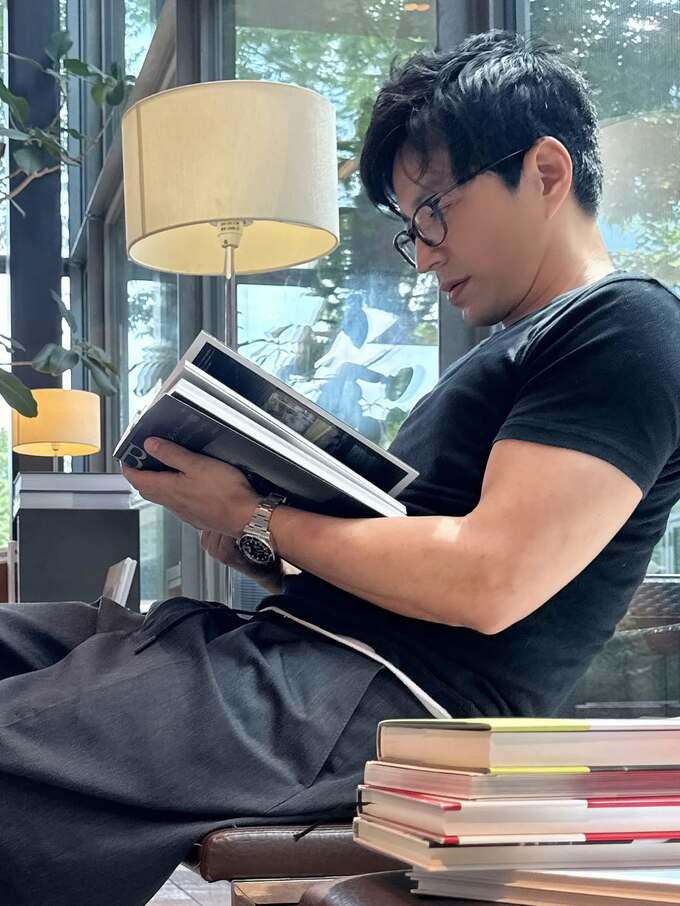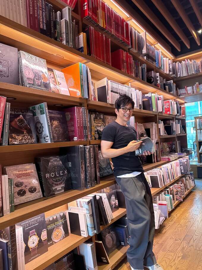 また、腕時計をテーマにした書籍がぎっしりと並ぶ書棚を背に微笑んでいて、興味ある一冊に巡り会ったのかもしれません。
