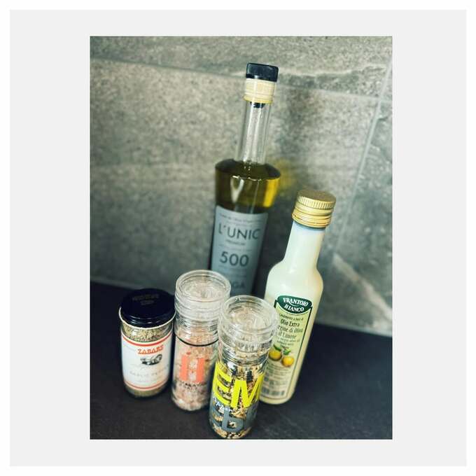 吉瀬さんは「レモンオリーブオイル&レモンペッパーは常備」「これがあるとレモン買い忘れても安心」とテキストして、それぞれのボトルを集めた接写を投稿。レモン系以外に岩塩やガーリックペッパーらしきボトルもあり、吉瀬さんの美味しさへのこだわりがうかがえます。