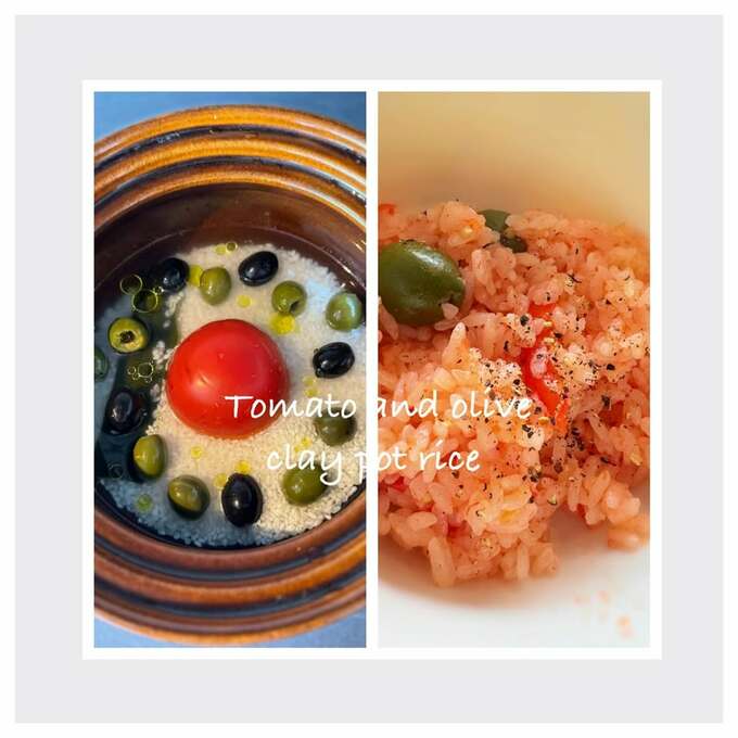 次に「久々にトマトとオリーブの土鍋ご飯」とテキストして、 “炊く前” “できあがり” の2点の写真を組み合わせて投稿。 “炊く前” は土鍋の中に浸されたお米の上に昆布が敷かれていて、水埜上にはオリーブの実が浮かんでいます。そして真ん中には皮付きのままのトマトが丸ごと鎮座。 “できあがり” では、炊きあがったそれらがざっくり混ぜられて、お茶碗に盛られ、かるく胡椒を振られている模様です。