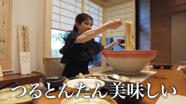 まるで旅館のような一室に通された松村さんは、多彩なメニューを前に「いろいろ食べたいじゃないですか?」「ってなると普通に(一人前)1玉でいい説」どれだけ食べるの、とマネージャーさんに聞かれた松村さんは「3杯はいく!」と豪語します。