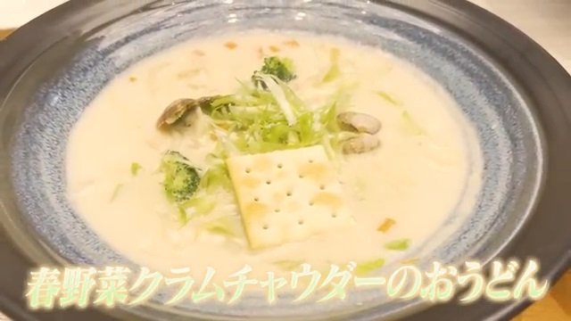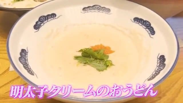 運ばれてきた “おうどん” たちに松村さんたちは驚き、とくに「大きすぎるおうどん」は丼から中身から何もかも大きくて驚くばかり。けれど松村さんは気を取り直してにこにこしながら「明太子クリームのおうどん」からの「クラムチャウダーのおうどん」という順番で食べていきます。