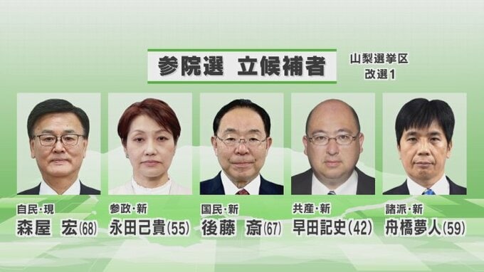参院選は今月20日に投票と開票が行われ、山梨選挙区には現職と新人合わせて5人が立候補しています。