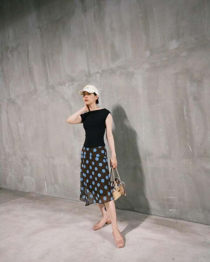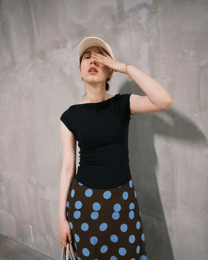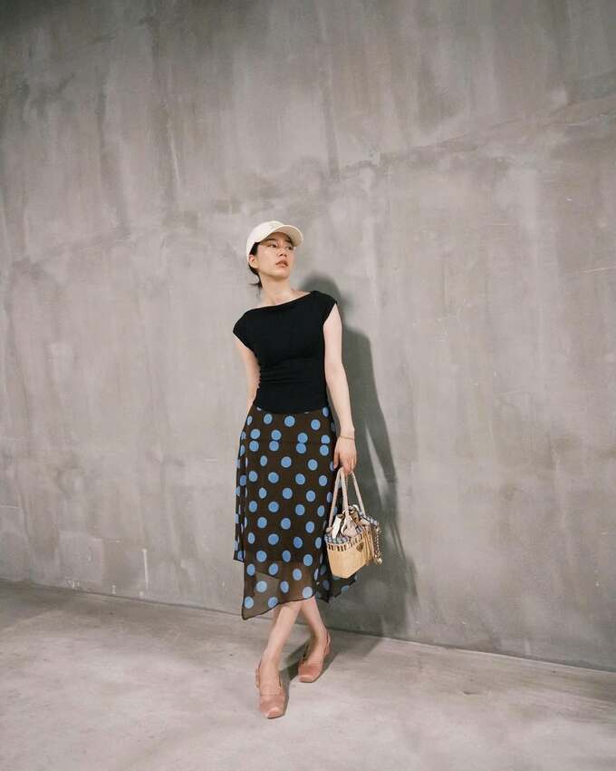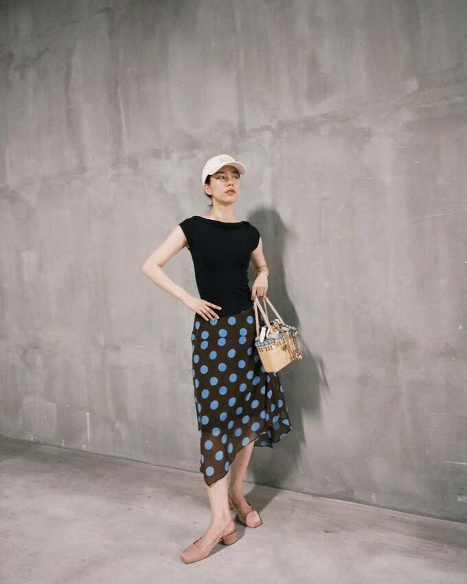投稿された写真には、のんさんが白いキャップをかぶり、黒いトップスと青い水玉模様のスカートというシンプルながらも夏らしい装いを見せています。