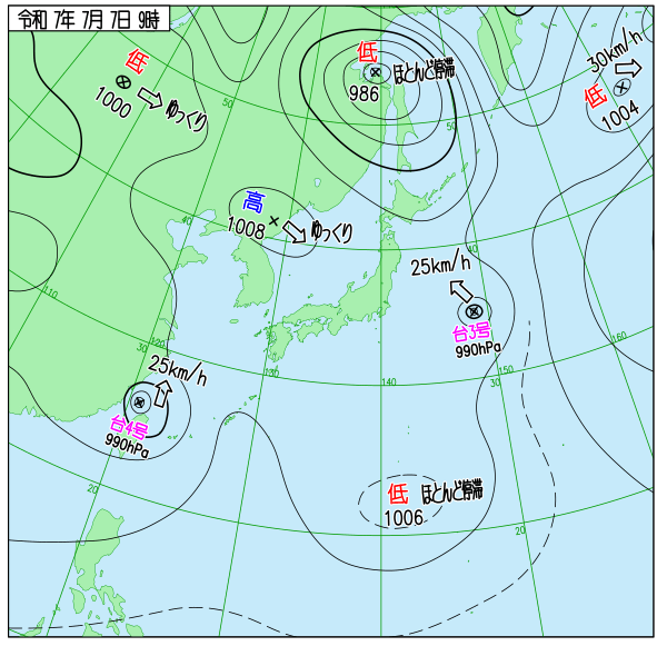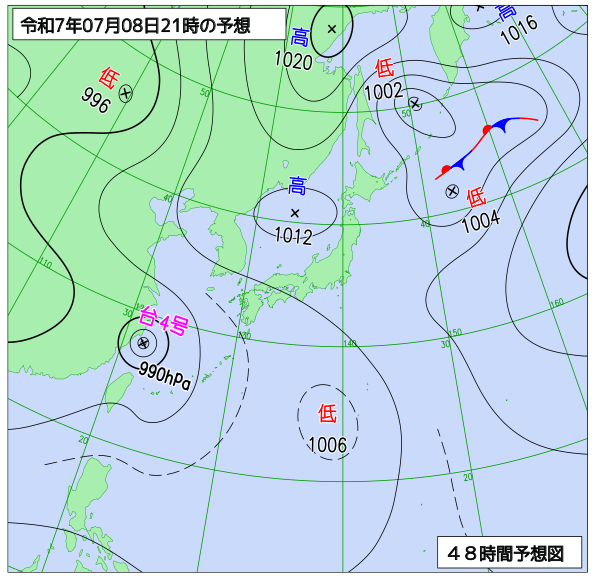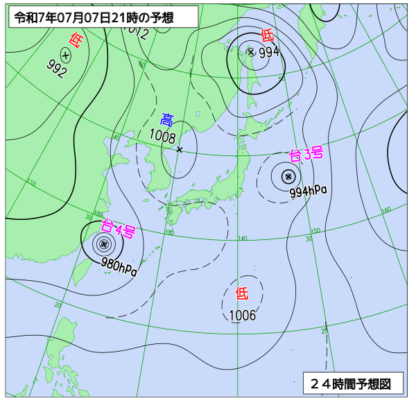 【台風情報】ダブル台風は日本から遠ざかる見込み 4号(ダナス)はUターンして10日に「熱帯低気圧」になるか 3号(ムーン)は東へ東へ…9日に「温帯低気圧」になるか【雨と風のシミュレーション・気象庁の最新情報まとめ】 青森テレビ 2025年7月7日(月) 14:05 国内 24時間後・48時間後の『予想天気図』 気象庁HPより 気象庁HPより 気象庁HPより