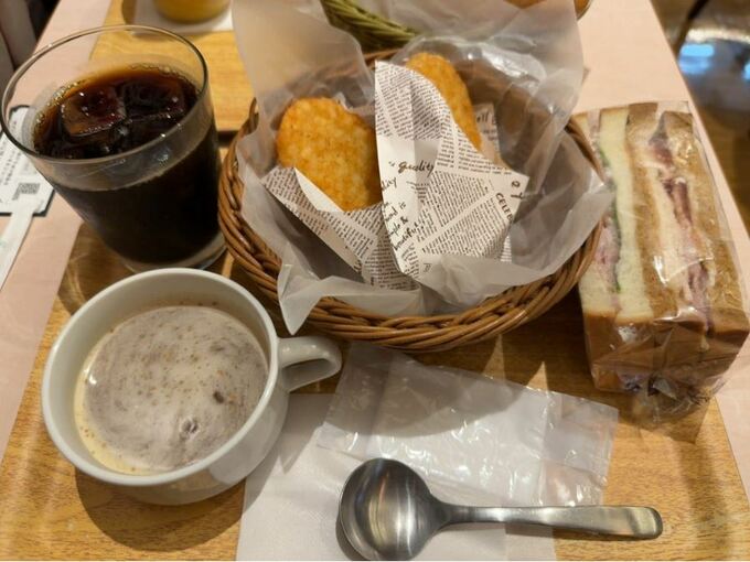続けて、「大好物のハッシュポテトがあったので頼みました あとはコーヒー、オニオンスープ パン屋でささっといただきました」と、朝食の様子を紹介しました。
