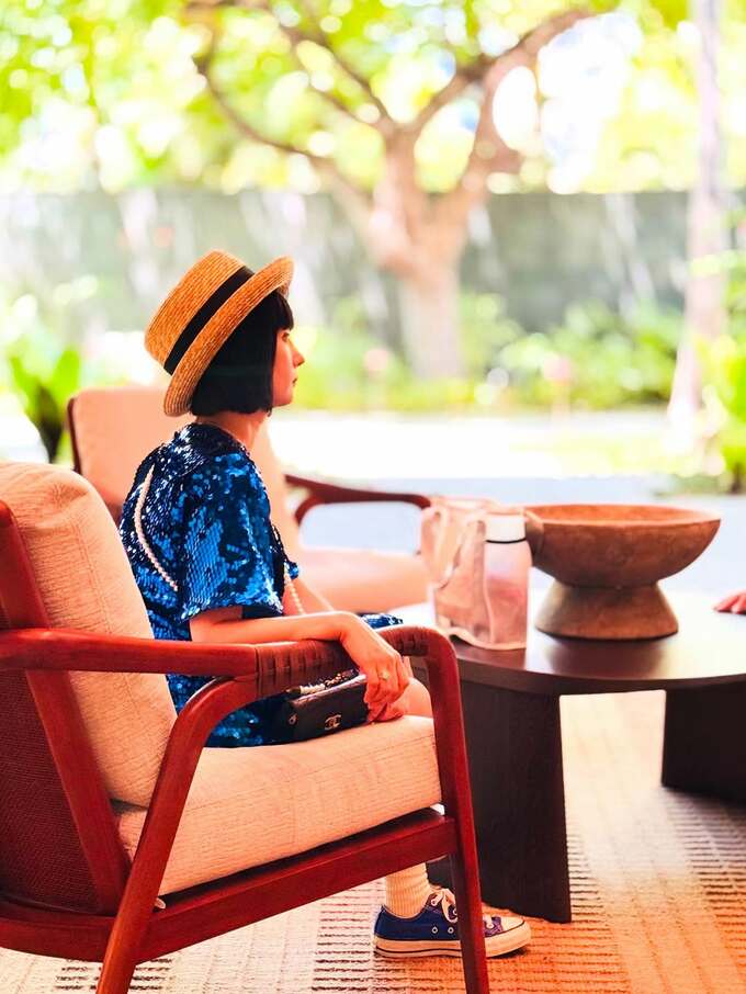 青いスパンコールのワンピースは派手な印象ながらも、カジュアルなスニーカーと組み合わせた千秋さんのコーディネートは、リゾート地らしい自由な雰囲気を醸し出しています。